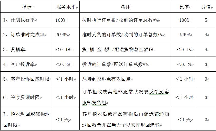 3.服務(wù)要求(1)遵循最安全,最合理的運(yùn)輸方式和時(shí)限、提供最優(yōu)的價(jià)格。將貨物直接送達(dá)指定的收貨人。(2)對(duì)于當(dāng)天15:00前的出庫(kù)貨物,必須當(dāng)日取完,并在當(dāng)日根據(jù)實(shí)際發(fā)貨情況安排寄送。需提供每天物流單號(hào)。(3)貨物出現(xiàn)損壞、丟失等情況需要出具正式的書面說(shuō)明,并按貨物丟失造成損失進(jìn)行賠付。(4)提供保質(zhì)保量和高效的服務(wù),包括節(jié)假日,配送投遞提供12小時(shí)服務(wù)。(5)責(zé)任感:業(yè)務(wù)員必須細(xì)心核對(duì)運(yùn)輸貨物,如發(fā)現(xiàn)物件與實(shí)際貨物存在不符時(shí),應(yīng)現(xiàn)場(chǎng)核對(duì),減少錯(cuò)誤率。(6)要求把貨物送到客戶手里后的運(yùn)輸單據(jù)保存一年。(7)要求指派專人負(fù)責(zé)我方貨物運(yùn)輸業(yè)務(wù)。(8)要求派人對(duì)我方打包好的貨件在我方現(xiàn)場(chǎng)進(jìn)行分單,以及搬運(yùn)作業(yè),我方現(xiàn)場(chǎng)監(jiān)督。如發(fā)現(xiàn)重量、箱號(hào)與事實(shí)不符,需重新作業(yè),并處以每單50元的罰金。(9)國(guó)內(nèi)配送時(shí)限(門到門):根據(jù)所運(yùn)輸貨物到達(dá)省份以最快速度送達(dá)。在規(guī)定的時(shí)間內(nèi)務(wù)必送達(dá),否則承擔(dān)客戶的投訴或賠償責(zé)任。(10)對(duì)于寄送的貨物客戶未簽收、包裝破損、重量不符的由中標(biāo)方承擔(dān)一切責(zé)任和后果。