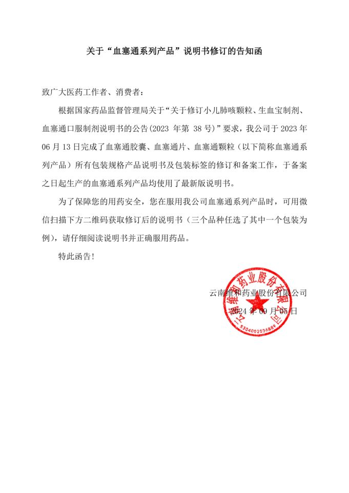關(guān)于“血塞通系列產(chǎn)品”說明書修訂的告知函