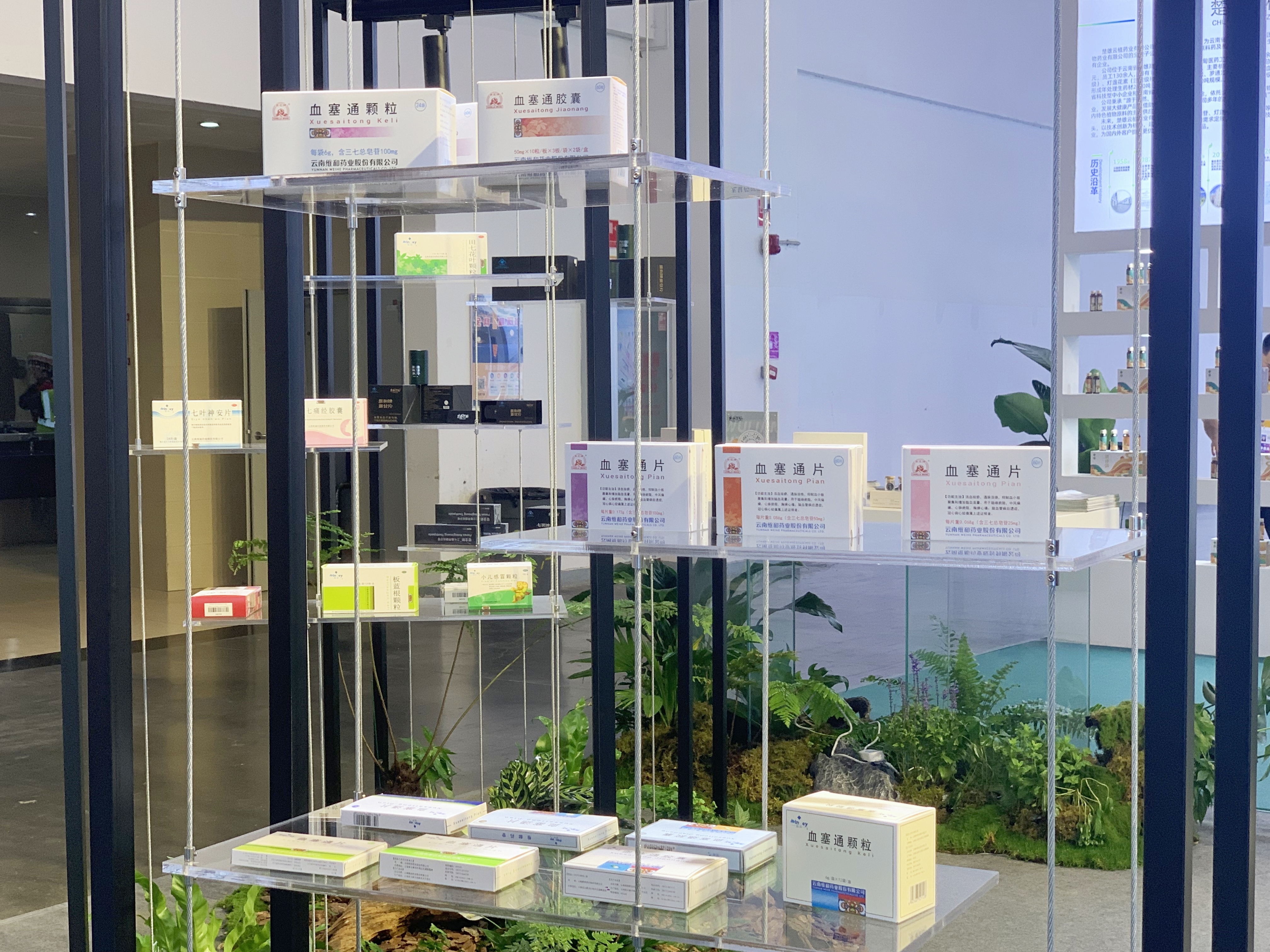在產(chǎn)品展示區(qū),我們創(chuàng)新地將展架與三七植株、綠植和維和的產(chǎn)品巧妙融合,讓每一件產(chǎn)品都仿佛生長于自然之中,增加了展品展示的生動性。